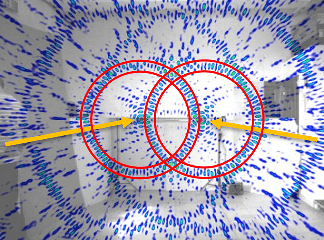 실제 환경에서는 공간적 에일리어싱으로 인해 상한 주파수에 제한이 생기지만, 그럼에도 불구하고 정확한 음원 위치 추정은 여전히 가능하다. 그림 3은 Ring48 마이크 어레이(직경 0.75 m)를 사용하여 44 kHz 초음파 음원 두 개를 위치 추정한 결과를 보여준다. 빨간 원 내부에서 뚜렷한 에일리어싱 현상이 관찰되지만, 실제 음원 위치(노란색)는 여전히 정확하게 식별된다.