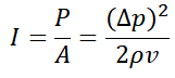 I는 Intensity이고 Power 를 면적(A)로 나눈 값입니다. delta P는 압력(Pressure)값의 변동량이고 ρ 는 매질의 밀도를 의미하고 v는 소리의 속도 입니다. 결국 소리의 세기는 음원과 측정지점 사이 매질(ex, 공기)과 음압의 세기와 측정지점의 면적에 의해 결정 됩니다.