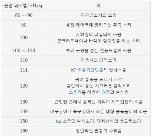 | 160 | 1 × 10^4 | 고막 파손 |