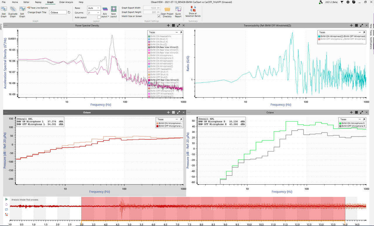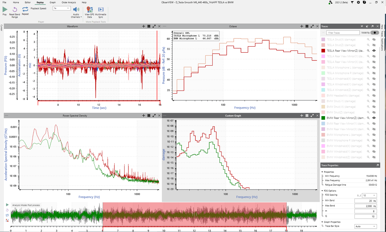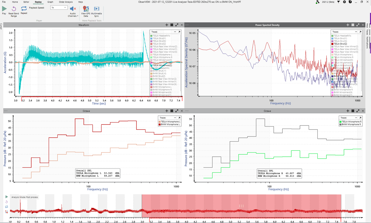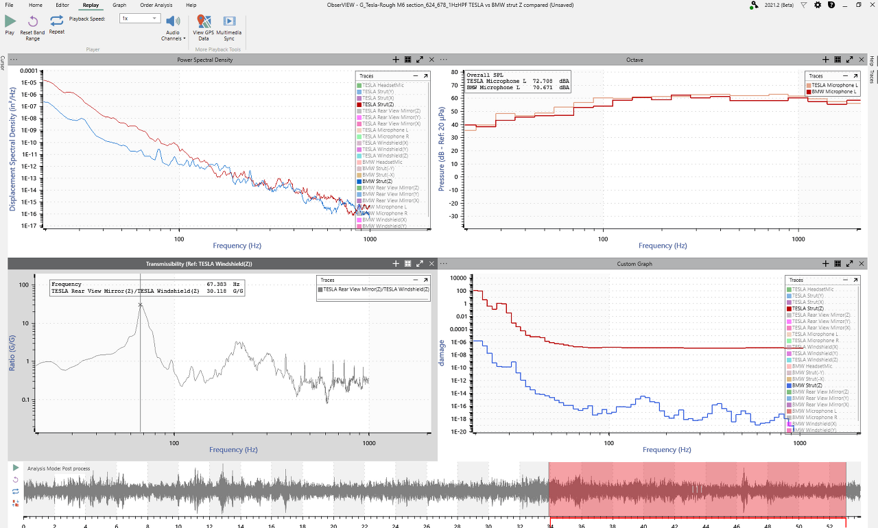 가속도 센서에 더해 마으크로폰의 소음 측정과 고프로의 동영상, 헤드셋, GPS를 ObserView 소프트웨어의 Multimedia Sync 기능을 사용하여 연계해서 분석할 수 있습니다.