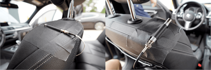 2개의 마이크로폰은 위 그림과 같이 운전석에 왼쪽 오른쪽 각 각 배치 합니다. 운전자는 헤드셋을 써서 오디오의 이벤트 상황을 녹음합니다.