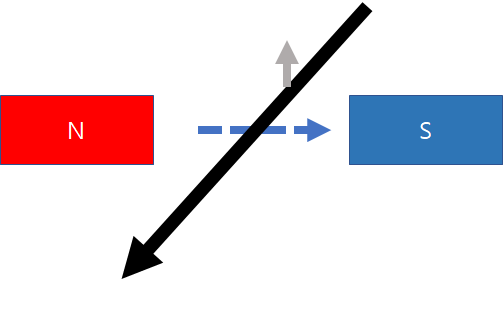 위 그림처럼 파란색 점선으로 자계가 형성되어 있고 검은색 전선이 자계 사이를 지나가는 형태를 생각 해봅시다. 오른쪽 나사의 법칙에 의해 전선에 전류가 흐르면 반시계 방향으로 자기장이 생성 됩니다.