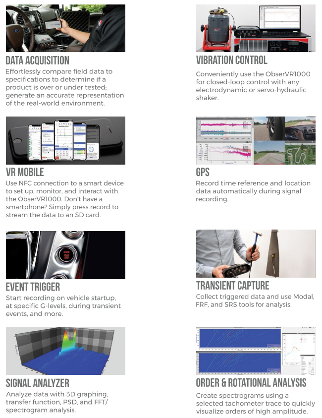 ObserVIEW 는 데이터 분석 소프트웨어입니다. 데이터를 Open, View, Edit을 시간 도메인에서 진행할 수 있습니다. GPS, Audio, Video 측정값을 시간 도메인의 라이브(Live) 데이터와 Sync를 맞춰서 사용 가능 합니다.