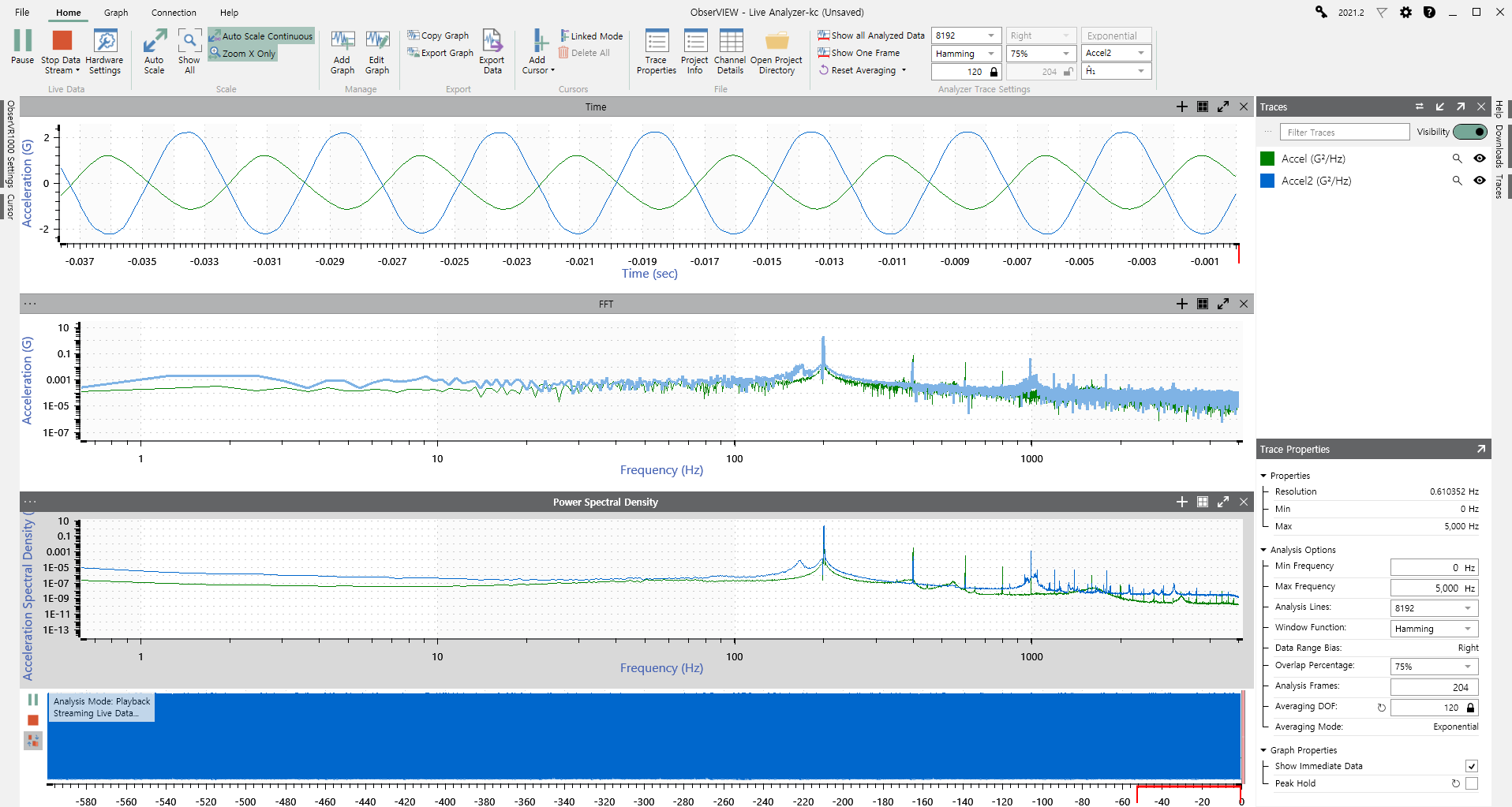 아래는 ObserVR1000 DAQ 장치를 사용해서 200Hz에서 사인 진동 (Sine Vibration) 하는 진동 시험기 위의 시편에 가속도를 측정해서 ObserVIEW 소프트웨어로 분석한 내용 입니다.