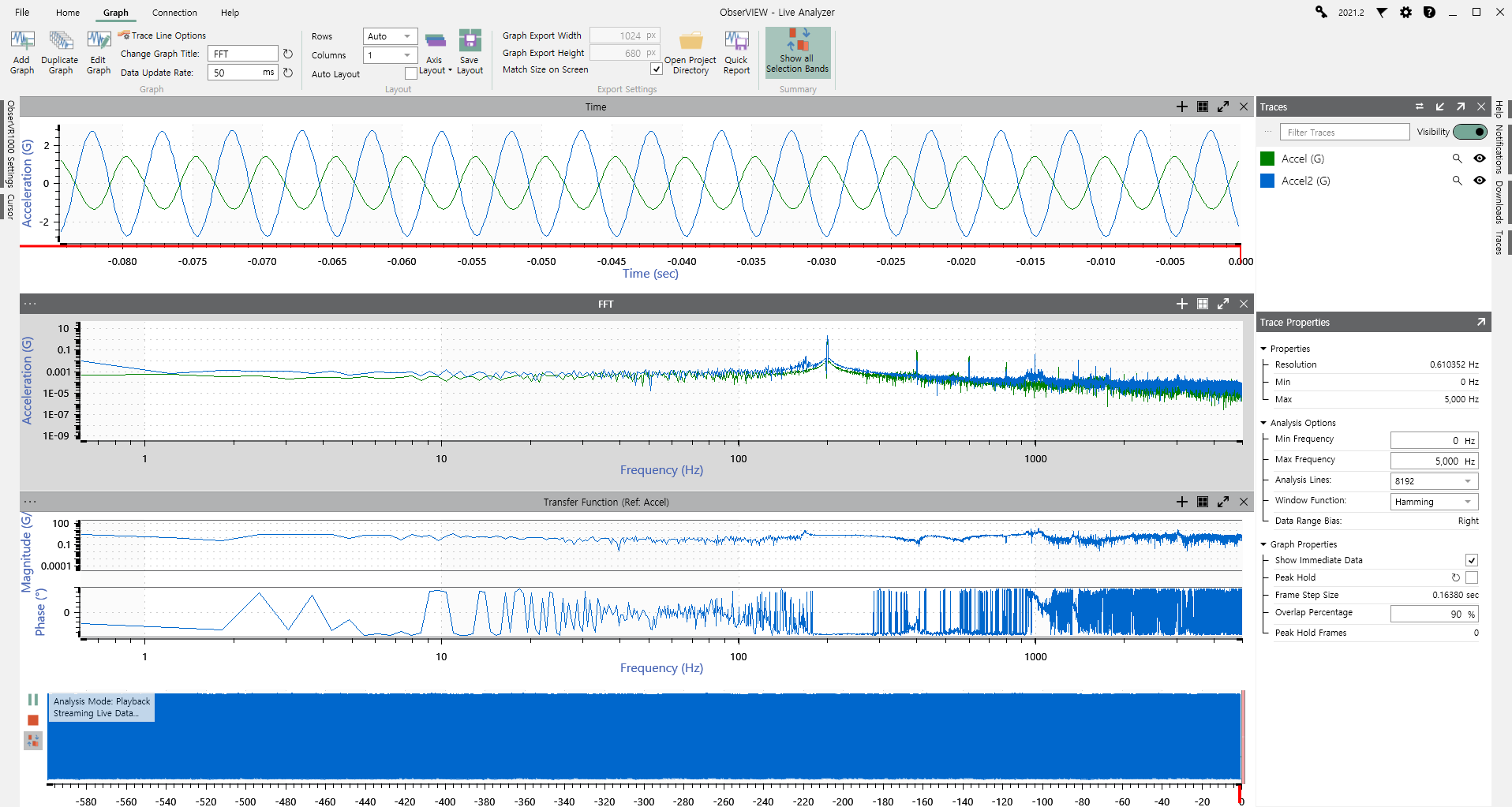 아래는 ObserVR1000 DAQ 장치를 사용해서 200Hz에서 사인 진동 (Sine Vibration) 하는 진동 시험기 위에 가속도 센서 Ch1을 시편에 가속도 센서 Ch2를 설치 하고 가속도를 측정해서 ObserVIEW 소프트웨어로 분석한 내용 입니다.