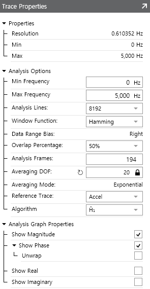 Property 값은 Sample rate와 Frequency line 수에 의해 결정 됩니다. Window Function은 Welch's method를 전개하면서 시간 도메인에서 발생하는 Noise를 줄여 줍니다. Window에서 줄어든 값을 회복하기 위해 Overlap을 사용 합니다. DOF는 전달 함수 처리를 위한 Spectral Density 생성에 사용 됩니다. Algorithm은 앞서 estimator 설정에 사용 됩니다.