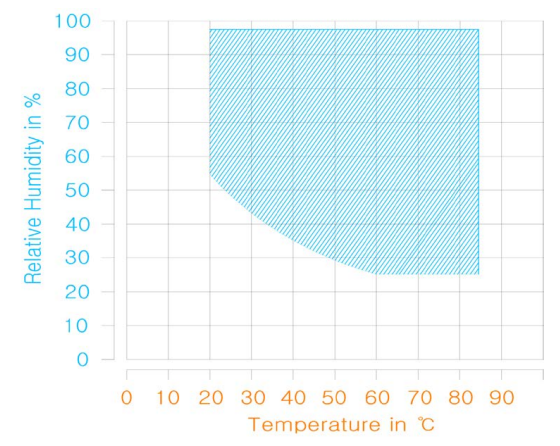 위 그래프는 온도 변화에 따른 챔버가 조절할 수 있는 습포 범위 입니다. 각 챔버 회사의 동작범위를 이해한 후 챔버를 선택하여야 합니다.